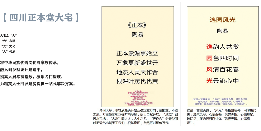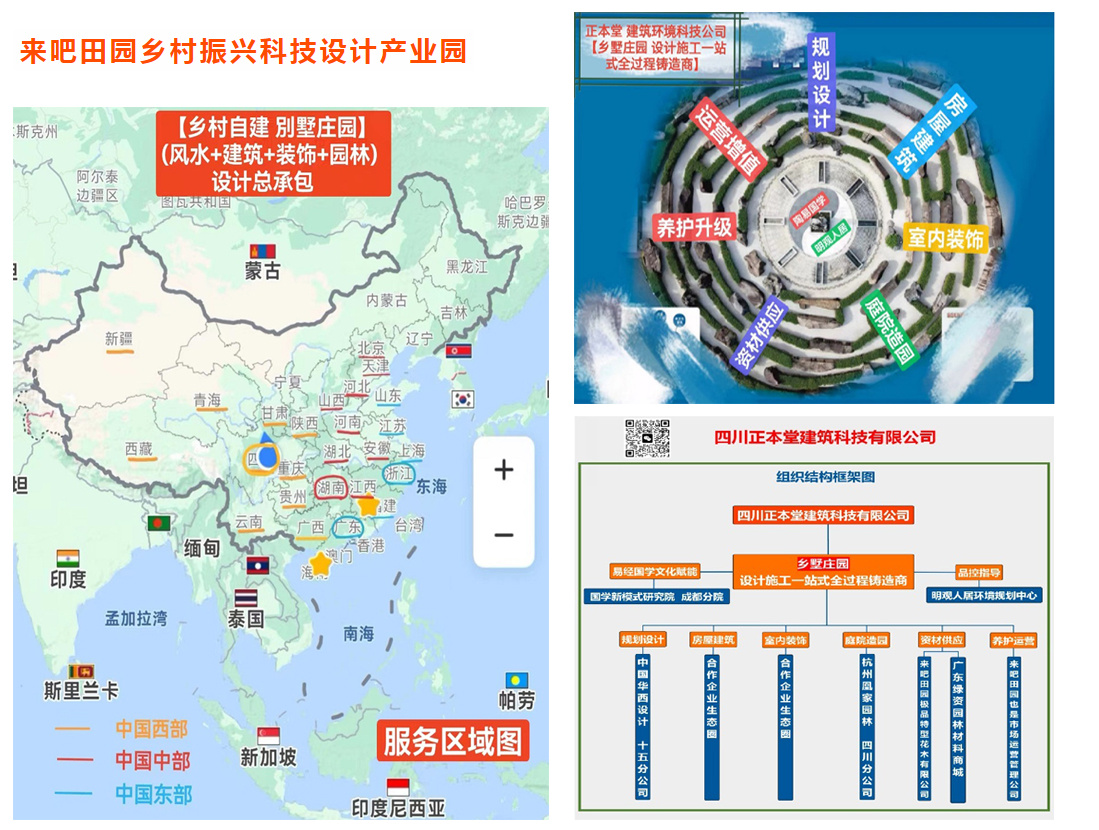 公司主要从事乡墅庄园设计施工业务,是设计施工一站式全过程铸造商。公司以国学新模式研究院成都分院进行易经国学赋能,以明观人居环境规划中心作为品控指导。公司以中国华西设计十五分公司进行规划设计,房屋建筑及室内装饰由合作企业生态圈提供技术支持,由杭州凰家园林四川分公司进行庭院造园,由来吧田园极品特型花木有限公司及广东绿资园林材料商城进行资材供应,由来吧田园也是市场运营管理公司进行养护运营,通过养护升级,运营增值。正本堂建筑科技公司秉承还本正源的理念,致力于成为设计的最本质、最正宗的源头和标准制定者。